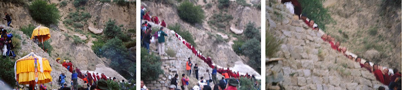 Our tour was purposely scheduled to observe the unfurling of the Tanka at the Drepung Monastery, marking the opening of the Shotun festival and probably the most important ceremony of the festival. In chinese, the ceremony literally means "sunbathing the big buddha". As our tour guide was afraid that the authorities will close the road leading up the monastary, we left the hotel in the wee hours of the morning. Alas, when we reach the foot of the hill the road is already closed. So we need to trek the long way up the hills. Luckily at about half way point our tour guide manage to negotiate for minibus to bring us up. Nevetheless, it is still a strenous climb from the monastery carpark to the unfurling site. Unlike other monastery (e.g. Tashilhunpo, Sera) where there is a purposely built wall for Tanka unfurling, in Drepung the Tanka is unfurled on the hillsite at the deep end of the monastery.