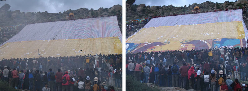 After reaching the unfurling site, it was a long wait in the dark for the ceremony to start at first light. It rained occasionally but luckily there was a tent at the site, so all the pilgrims and observers squeeze into the tent. The ceremony started at first light and it was an interesting experience. An unforgettable start to our Tibet tour.