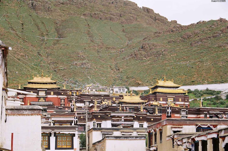 1. Full view of the Tashilhunpo Monastery. The buildings that stand out from the rest are (from left to right) Maitreya Chapel, Tomb of the Tenth Panchen Lama, Tomb of the 4th Panchen Lama, Tomb of the 9th Panchen Lama and the Tanka-unfurling festival wall